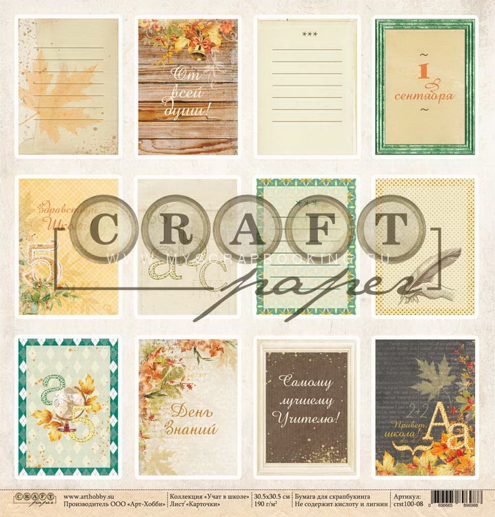 Бумага для скрапбукинга УЧАТ В ШКОЛЕ Карточки, 30,5*30,5 см, односторонняя