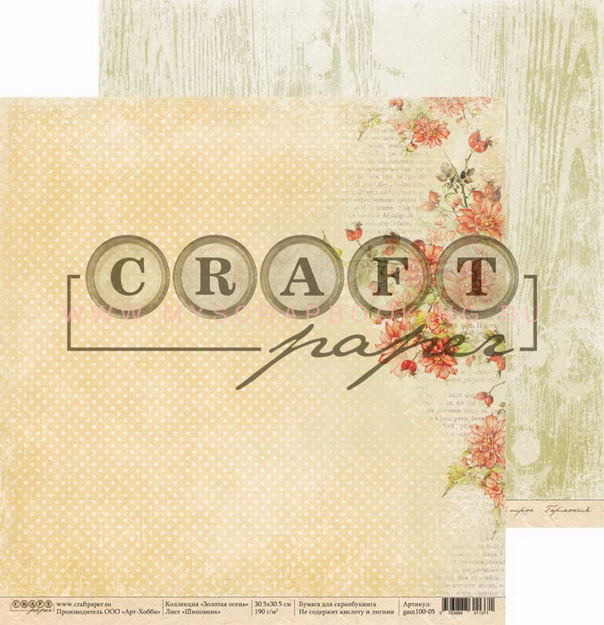 Бумага для скрапбукинга ЗОЛОТАЯ ОСЕНЬ Шиповник, 30,5*30,5 см, двусторонняя