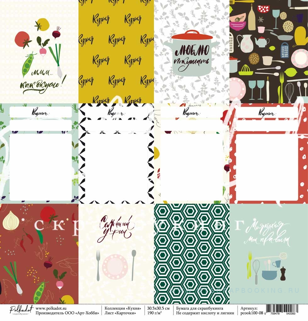 Набор бумаги для скрапбукинга КУХНЯ, 20x20 см, 8 листов, Polkadot